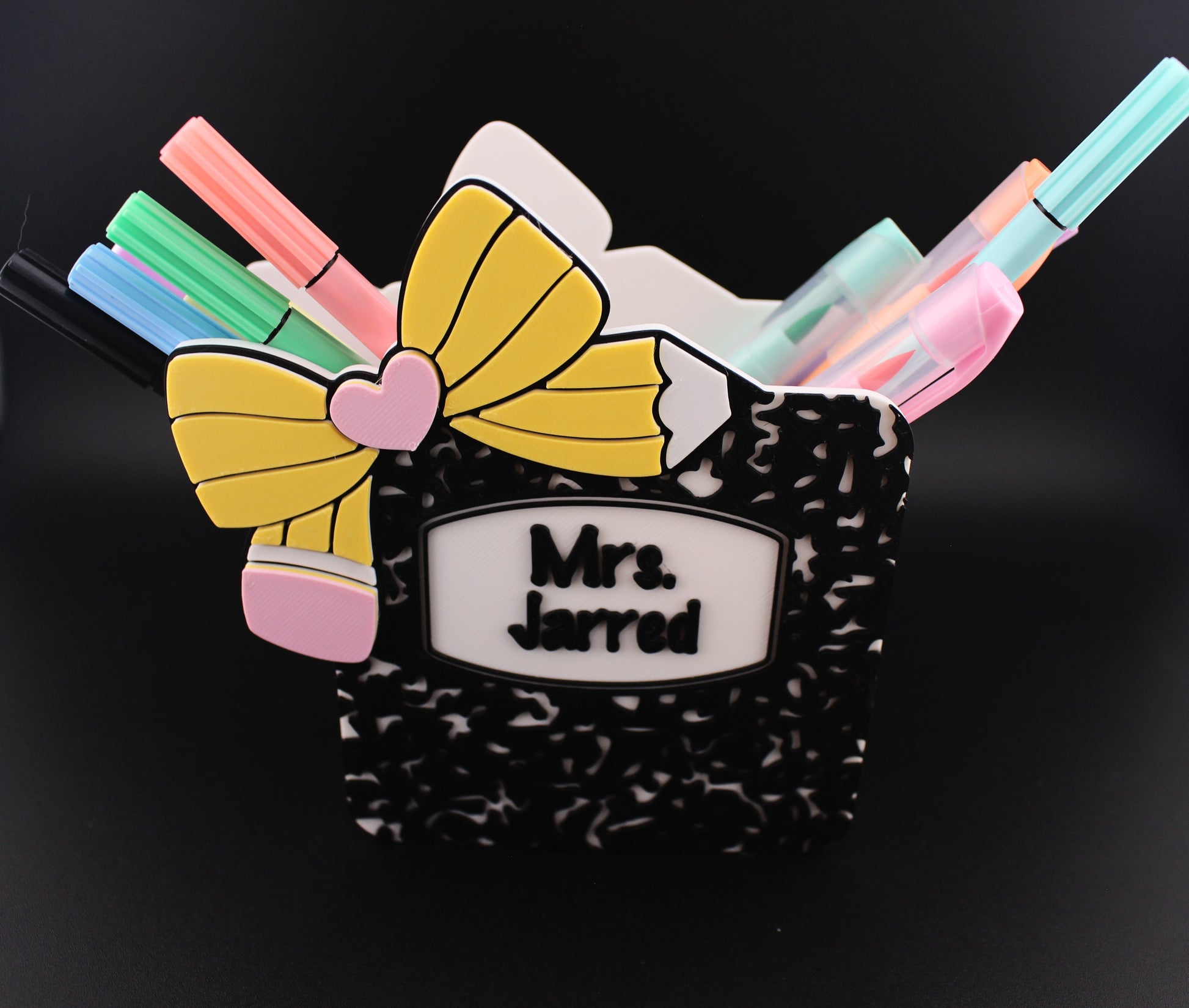 Keep your pens, pencils, and markers tidy with our Notebook Pen Holder, designed in a classic black-and-white composition book style and topped with a cute pencil bow. Measuring 13.5cm x 12cm x 5cm, it’s the perfect blend of fun and function for your desk.